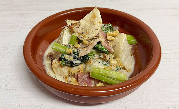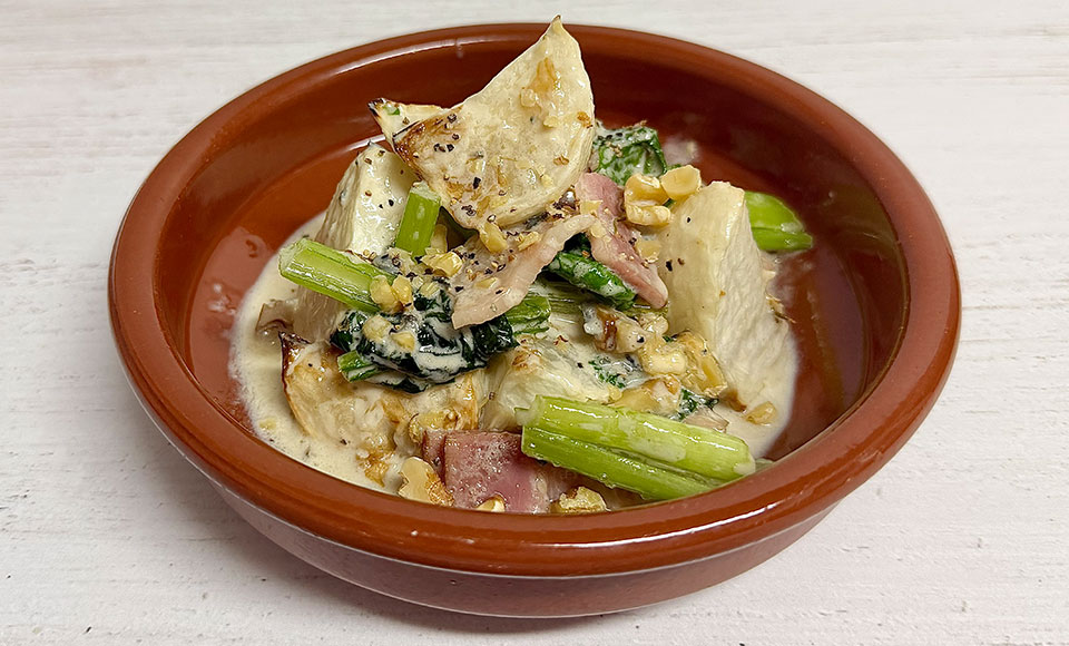 カブのやさしい甘みとベーコンの旨味を、ゴルゴンゾーラ・ピカンテのコク深いソースで包みました。やわらかくローストしたカブに、ワインの樽香とチーズの塩味が重なり、上品で奥行きのある味わいに。