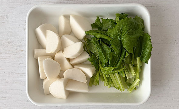 - かぶは皮をむき、6〜8等分に切る。葉は4-5cmほどに切る。 胡桃は荒く砕く。ベーコンは短冊切り。
