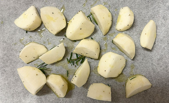 - カブにオリーブオイル・塩・黒こしょうをまぶし、200℃のオーブンで約13分ローストして軽く焼き色をつける。