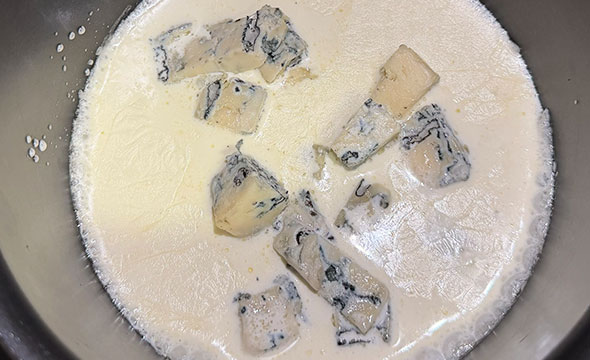 - 小鍋に白ワインを入れて中火で軽く煮詰め、生クリームとゴルゴンゾーラを加える。