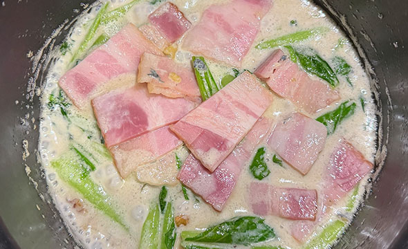 - 溶け始めたらかぶの葉とベーコンを入れて弱火で3〜4分ほど煮てバターを加えて仕上げる。