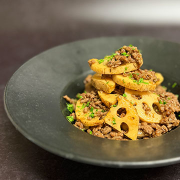 - スパイス香る蓮根と挽肉の赤ワインソテー