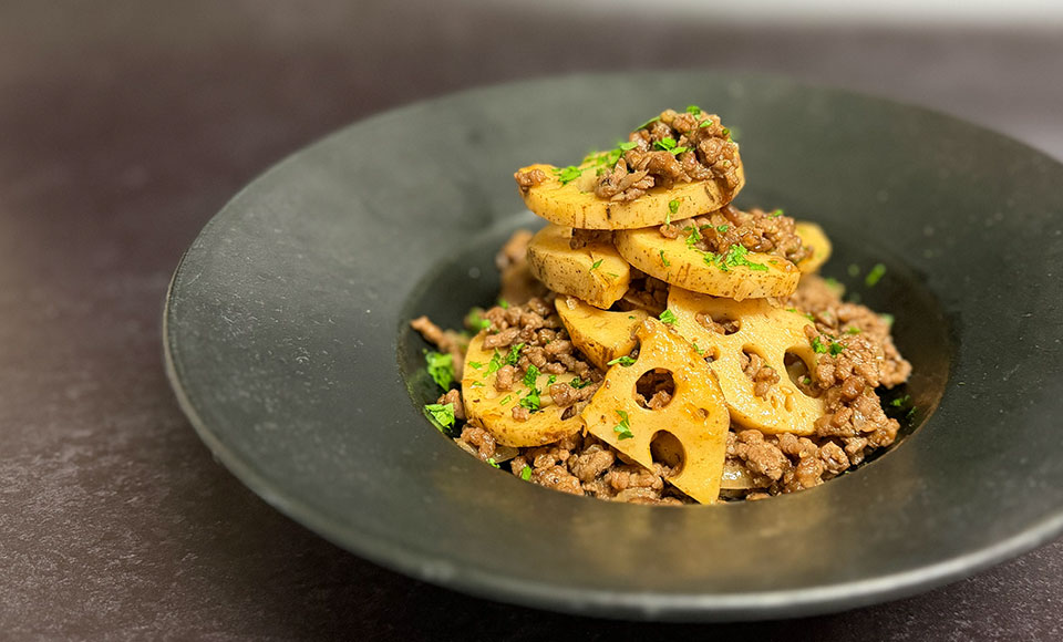 蓮根のほくっとした甘みと豚ひき肉の旨味を、赤ワインとスパイスで包み込みました。中濃ソースで厚みを出し、仕上げのイタリアンパセリで香りを引き締めています。