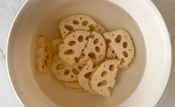 - レンコンはよく洗い、皮つきのまま1cm厚の半月切りにし、軽く酢水にさらして水気を拭いておく。 玉ねぎ、にんにくはみじん切りにする。