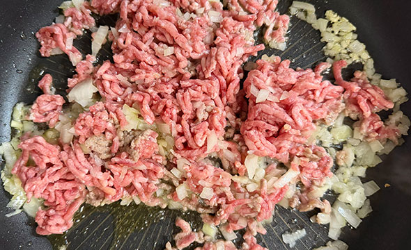 - フライパンにオリーブオイルとにんにくを入れ、中火で香りを出したら玉ねぎ・ひき肉を加えて炒め、肉の色が変わったらレンコンを加える。
