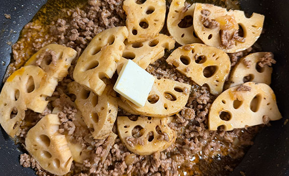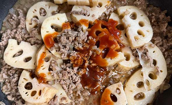 スパイス香る蓮根と挽肉の赤ワインソテー