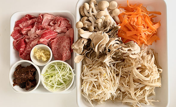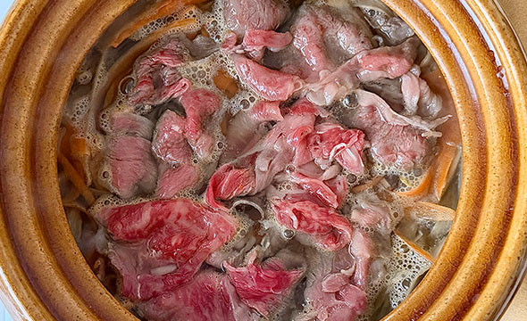 - 火を弱め、牛肉を広げて入れ、30秒〜1分で色が変わったらOK。