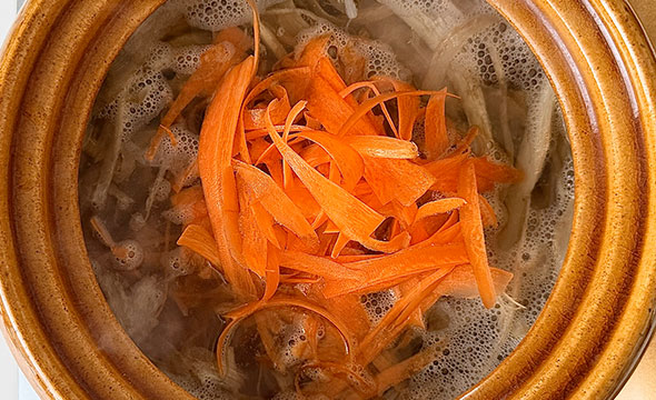 - 鍋にごま油を入れ、中火でごぼうを1分軽く炒める。