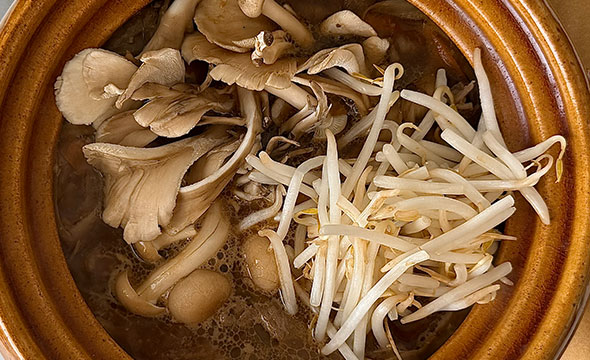 - 弱火にし、味噌を溶き入れ、舞茸・しめじ・もやしを加え、弱火で1〜2分温め、白髪ネギ、生姜をトッピングし、仕上げにごま油を回しかけて完成。