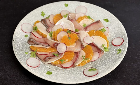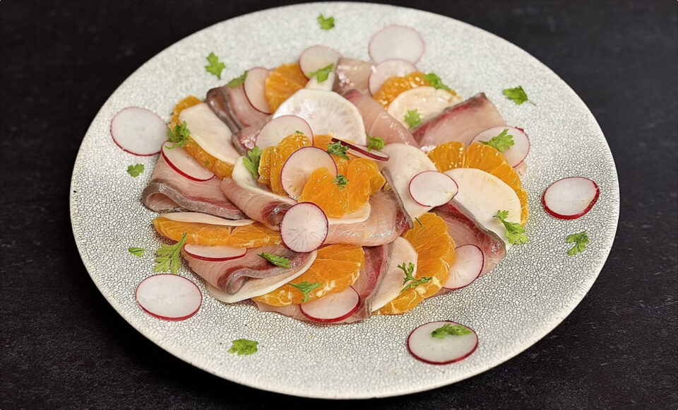 冬に旨みを増したぶりを、白ワインビネガーとオリーブオイルでやさしくマリネして、爽やかなみかんや瑞々しいかぶ・ラディッシュと合わせたカルパッチョです。ワインと一緒に心地よく楽しめる軽やかな前菜です。