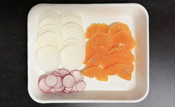 - 器にぶりを広げ、かぶ・蜜柑・ラディッシュをバランスよく並べる。チャービルを散らして仕上げる。