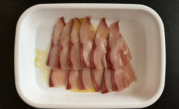- ぶりにひとつまみの塩をふり、白ワインビネガー・オリーブオイル・レモン果汁を合わせたマリネ液を回しかけ、ふんわりラップをかけて5〜10分ほどなじませる。