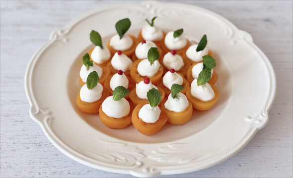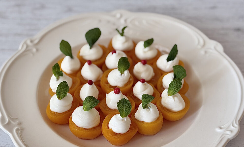 - 器に盛り、マスカルポーネを絞り袋で絞り、ミント、またはピンクペッパーをトッピングする。※絞り袋がない場合は、スプーンなどで掬いこんもりと盛る。※ おせちの金柑甘露煮を使う場合は、甘露煮とシロップに白ワインを同量加え、カルダモンとともに5分ほど温め直すだけでリメイクできます。