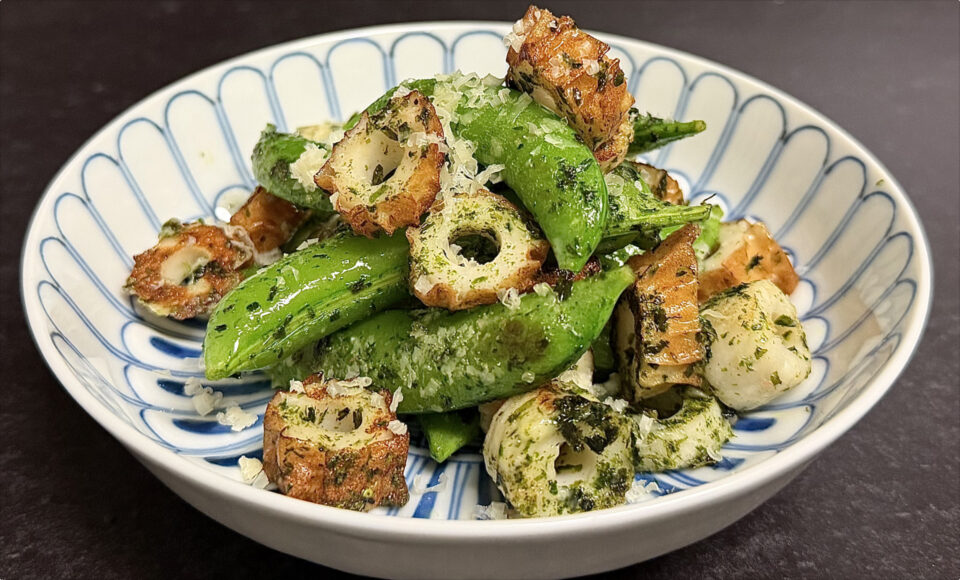春を先取りするパリッとしたスナップエンドウをバターで炒め、仕上げの醤油で香ばしく仕上げました。青のりの磯の香りと粉チーズのコクが重なり、シンプルながらも奥行きのある味わいは白ワインにピッタリです。