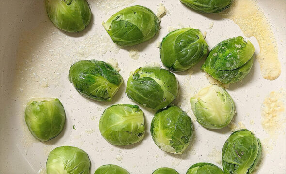 - 芽キャベツは半分に切り、にんにくはみじん切りにする。フライパンにバターとにんにくを弱火で熱し、芽キャベツの断面を下にして並べる。断面に焼き色がつくまで3分程じっくり焼き、裏返す。