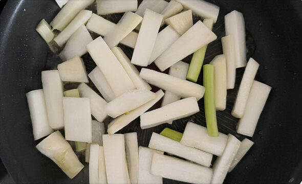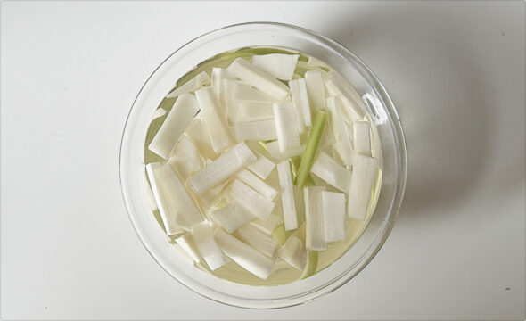 - フライパンにオリーブオイル少量(分量外)を熱し、うどを中火で1〜2分さっとソテーして軽く塩、黒こしょうを振る。