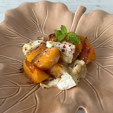 - 柿の甘みとカマンベールチーズの塩気を、バルサミコとはちみつでまとめた一皿。とろっと温かいチーズと果実の香りが、ワインにぴ... 【おすすめのワイン】ブラッククイーン:ブラッククイーンのベリー系の香りとやや高めの酸が、柿とカマンベールのまろやかな甘塩...